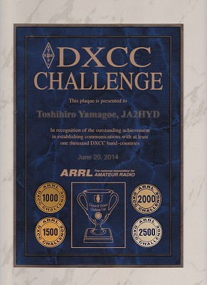 | ■DXCC Challenge このアワードは、160m〜6mまでの10バンドで、CWやPHONE、RTTYなどのモードに関係なく、各バンドでのエンティティの合計が1000を超えると貰えるものである。このため、WARCバンドに出ずに、このアワードを取得するのはムズイです。HYDは、5バンドのQuadアンテナを上げてからWARCバンドにもアクティブ(というか、パイルが少ない分、WARCに偏重しているかも)である。という訳で、LoTWによるCFMのみで2014年6月にゲット。 |